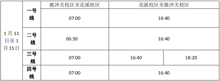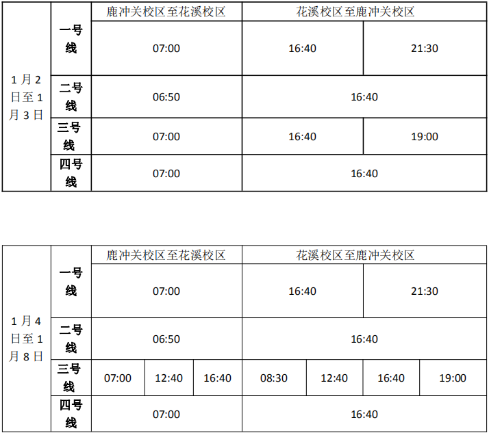 按照学校统一安排,华体会鹿冲关校区、花溪校区进入期末考试阶段, 1月8日考试结束,为满足期末考试需要和行政科研工作的开展,现对交通车作如下调整: